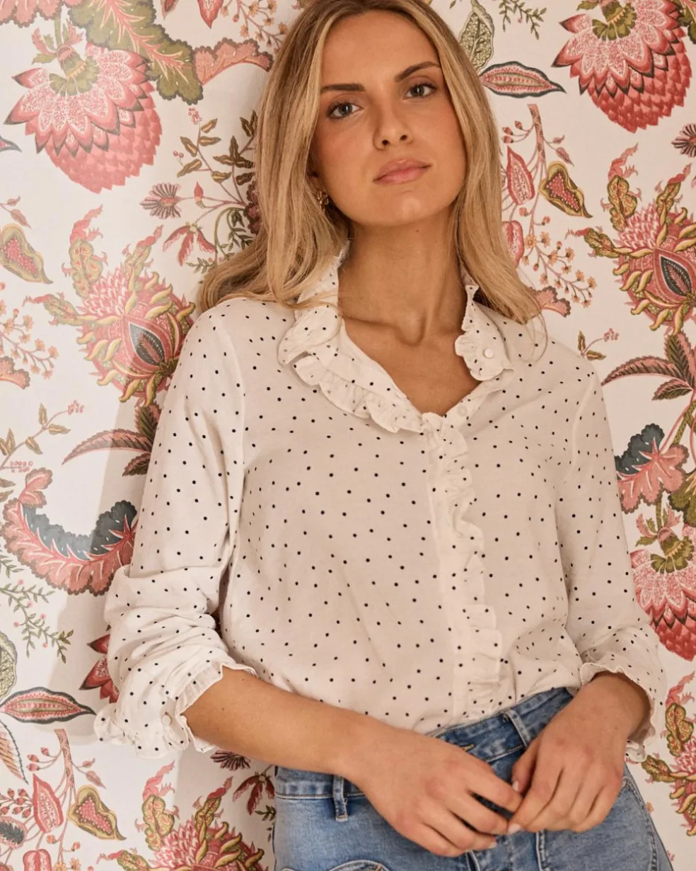 Blusa en tono crudo con lunares negros con hilera de botones y detalle de volante. Manga larga. Una blusa ideal para combinar en el día a día.