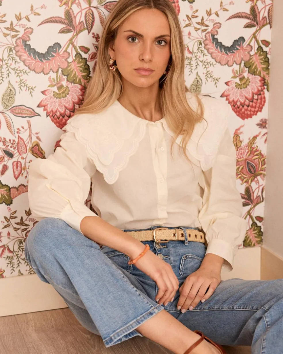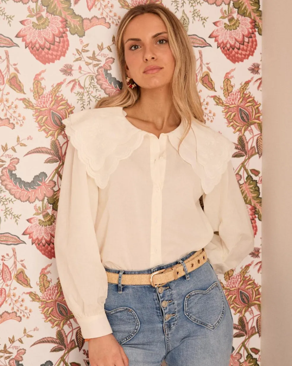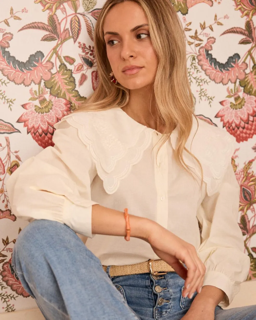 Camisa con estampado detalles y cuello, con hilera de botones y manga larga.