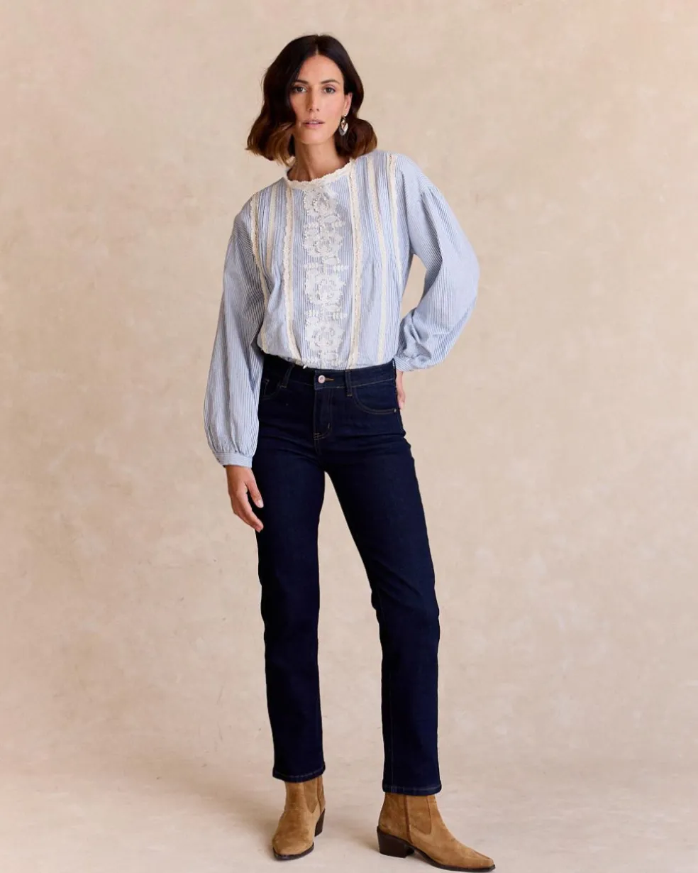 Camisa celeste con detalles bordados en color crudo, con cuello redondo y cierre de botones al frente. Sus mangas largas terminan en un ligero puño, y los delicados bordados añaden un toque romántico y elegante a la prenda.