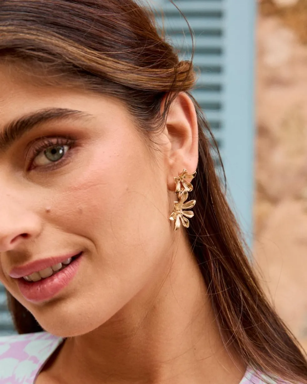 Pendientes color oro con forma de flores metálicas superpuestas.