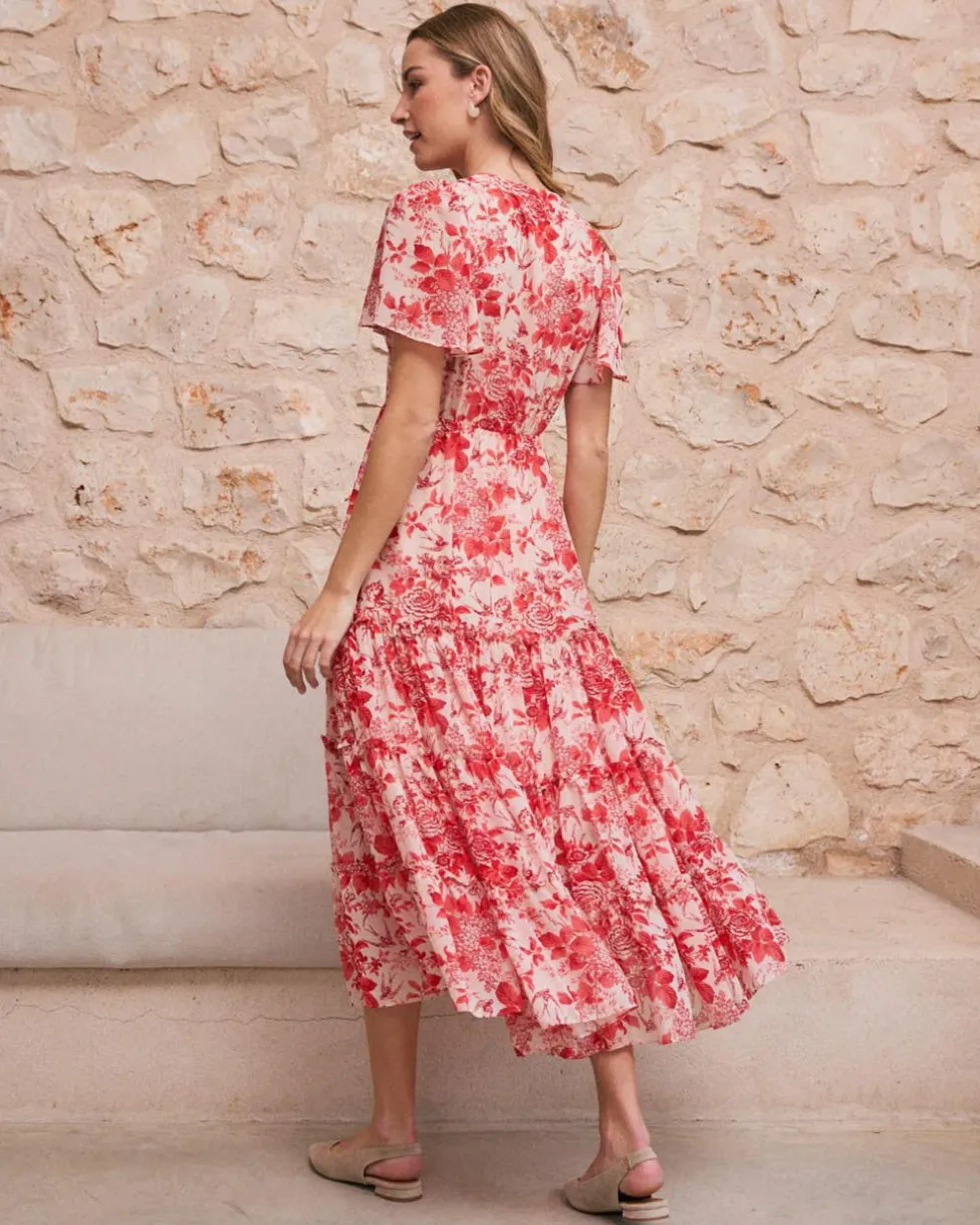 Vestido largo de color coral con estampado floral, escote en V, mangas cortas y cintura ajustada.