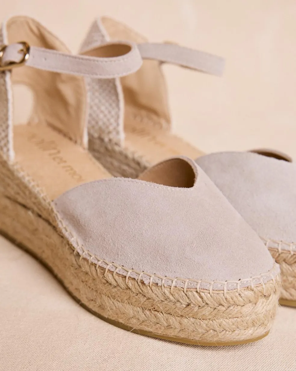 Alpargatas en color arena con pulsera, puntera cerrada, detalle de tejido trenzado en el talón y pulsera ajustable.