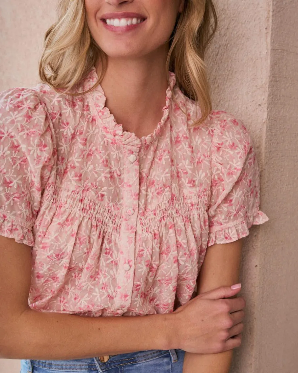 Blusa de color nude con estampado floral y delicados frunces en el pecho, manga corta abullonada y cuello sutilmente fruncido.