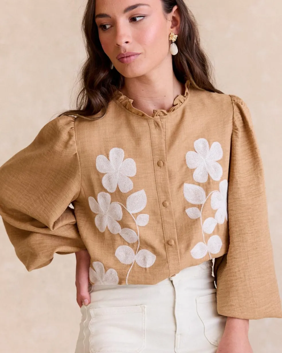 Camisa en tono camel con bordados de flores blancas en la parte frontal. Tiene cuello mao con volante, cierre de botones y mangas largas, perfecta para un look casual con un toque especial.