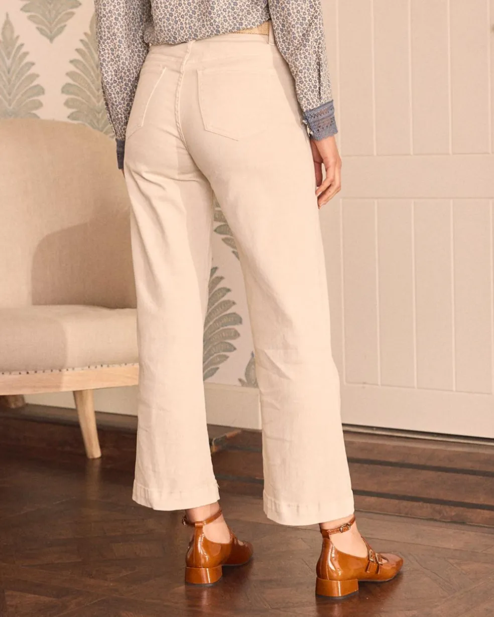 Pantalón denim color beige con bolsillos. Estilo recto con detalle trenzado.
