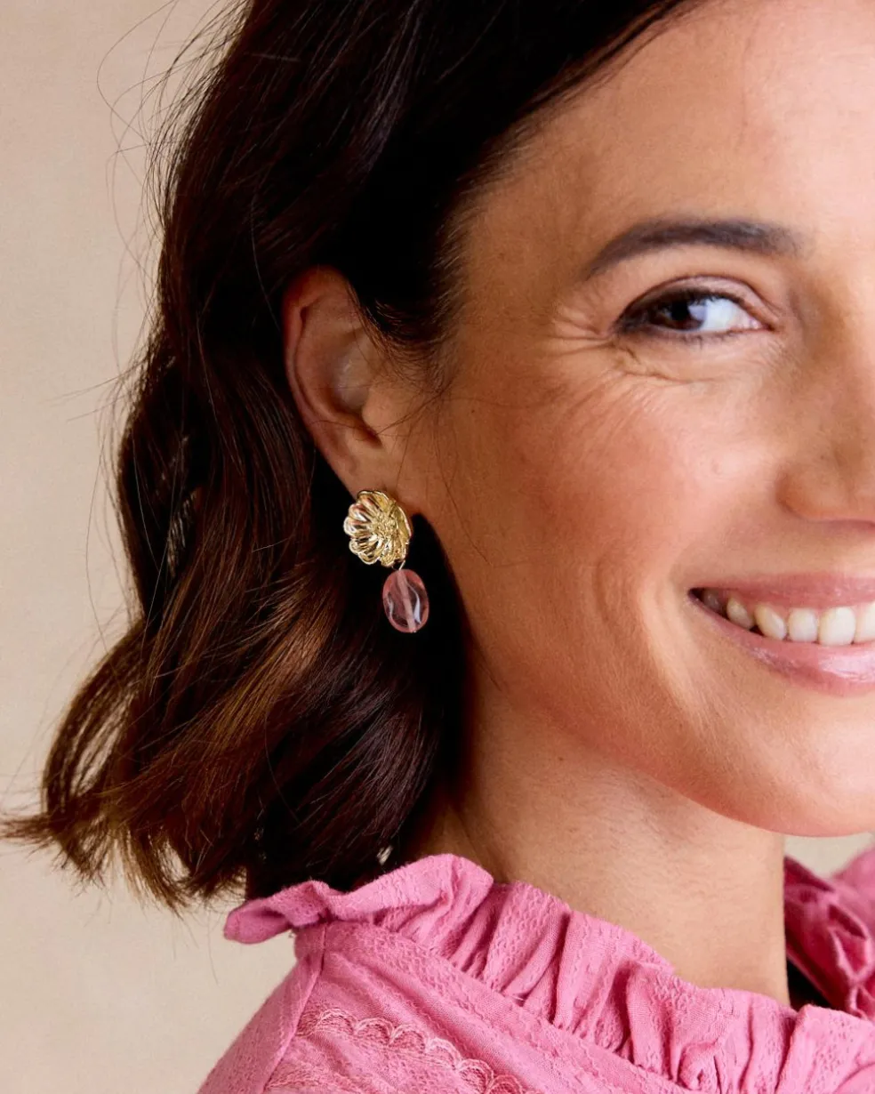 Pendientes con forma de flor en tono dorado y piedra colgante en rosa, ideales para aportar un toque delicado a tus looks.