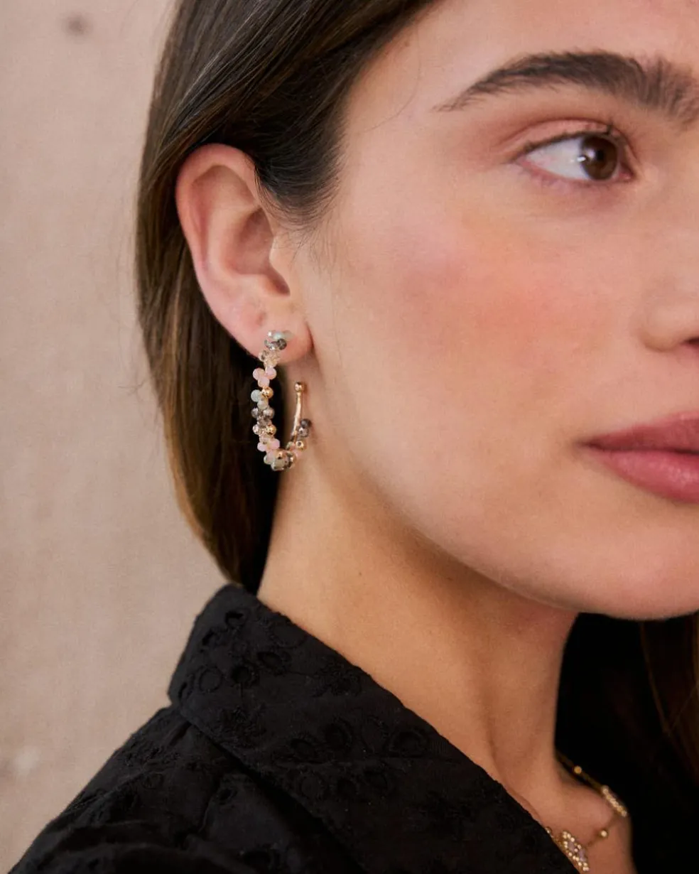 Pendientes de aro en color oro con delicados detalles de piedras multicolor.